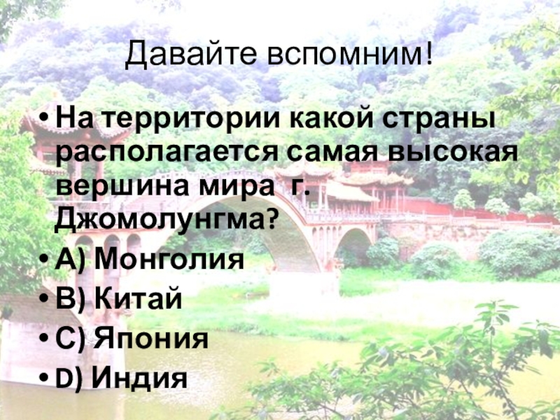 Давайте вспомним!На территории какой страны располагается самая высокая вершина мира г. Джомолунгма?А) МонголияВ) КитайС) ЯпонияD) Индия