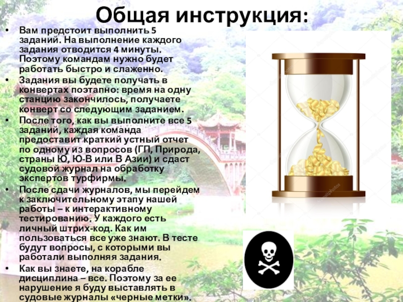 Общая инструкция: Вам предстоит выполнить 5 заданий. На выполнение каждого задания отводится 4 минуты. Поэтому командам нужно
