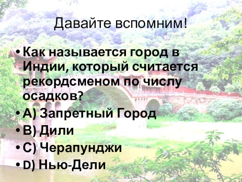 Давайте вспомним!Как называется город в Индии, который считается рекордсменом по числу осадков?А) Запретный ГородВ) ДилиС) ЧерапунджиD) Нью-Дели