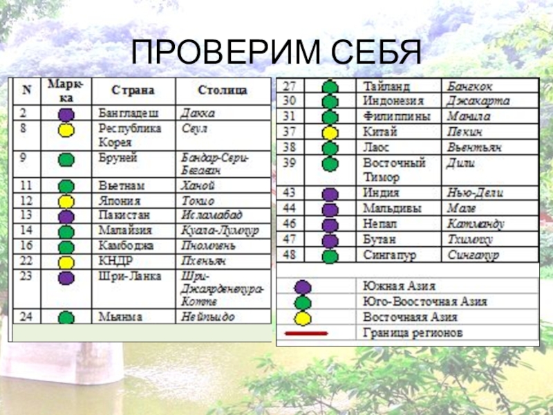 Юго-Восточную Азию: цветным карандашом нанести границы, в таблице тремя разными цветами промаркировать Южную, Восточную, Юго-Восточную Азию.