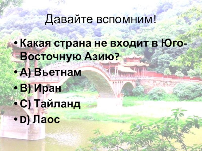 Давайте вспомним!Какая страна не входит в Юго-Восточную Азию?А) ВьетнамВ) ИранС) ТайландD) Лаос