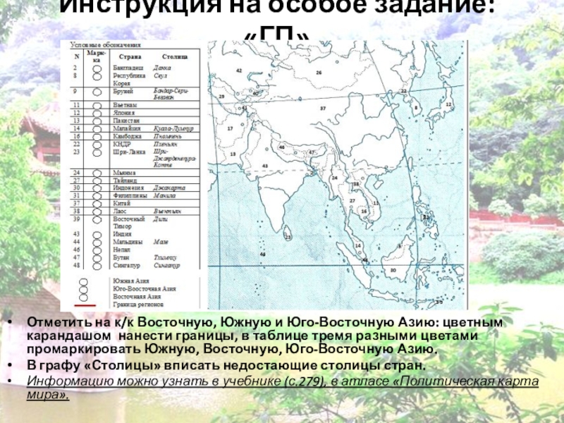Инструкция на особое задание: «ГП»  Отметить на к/к Восточную, Южную и Юго-Восточную Азию: цветным карандашом нанести