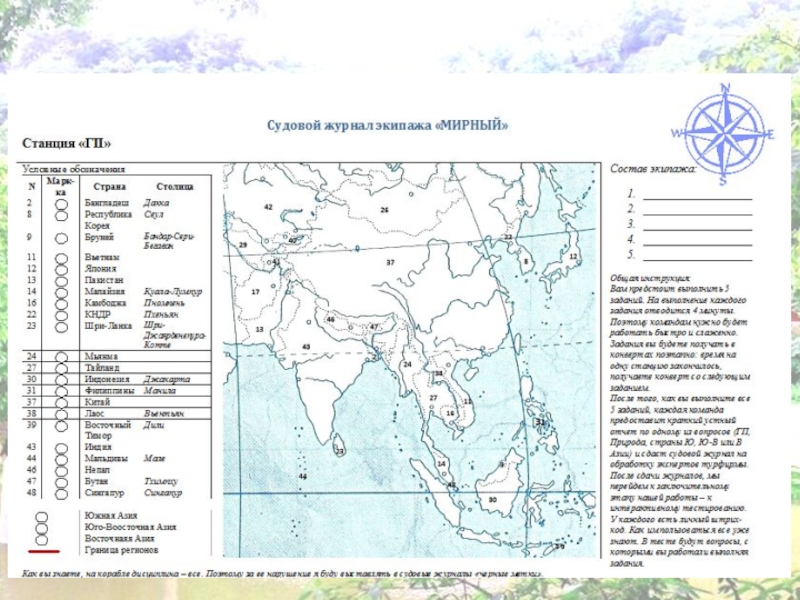 После того, как вы выполните все 5 заданий, каждая команда предоставит краткий устный отчет по одному из вопросов (ГП, Природа, страны Ю, Ю-В или В Азии) и сдаст судовой журнал на обработку экспертов турфирмы.