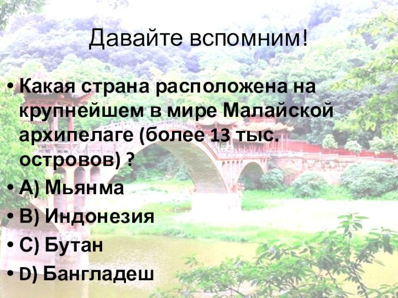 Давайте вспомним!Какая страна расположена на крупнейшем в мире Малайской архипелаге (более 13 тыс. островов) ?А) МьянмаВ) ИндонезияС)