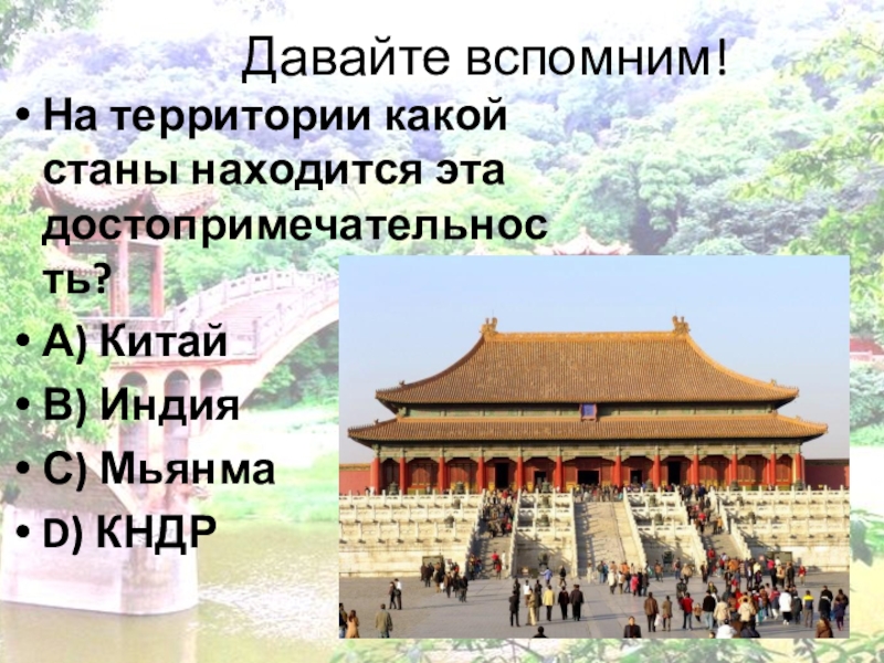 Давайте вспомним!На территории какой станы находится эта достопримечательность?А) КитайВ) ИндияС) МьянмаD) КНДР