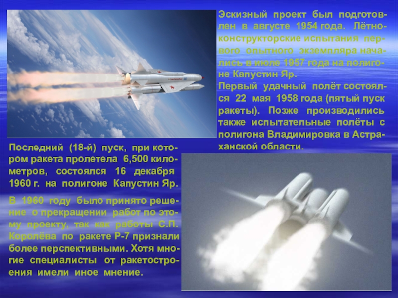 Последний (18-й) пуск, при кото-ром ракета пролетела 6,500 кило-метров, состоялся 16 декабря 1960 г. на полигоне Капустин Яр.
