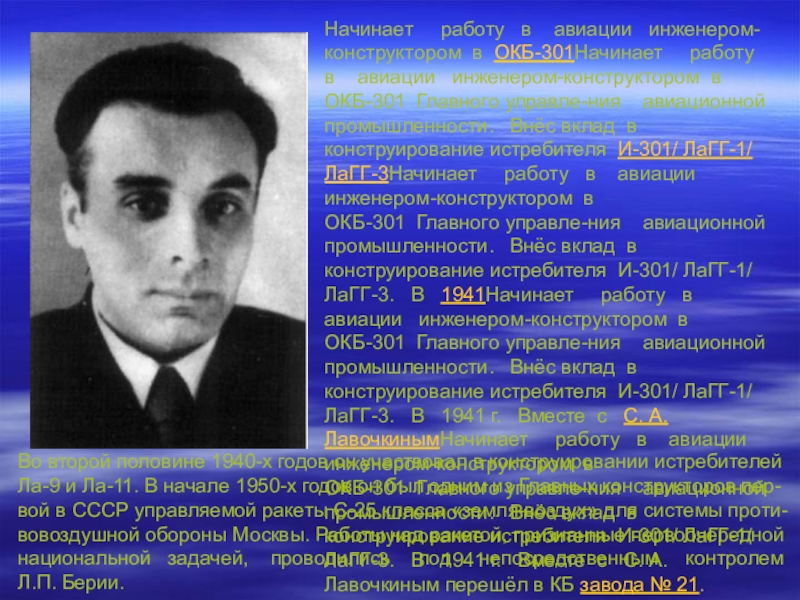 Во второй половине 1940-х годов он участвовал в конструировании истребителей Ла-9 и Ла-11. В начале 1950-х годов он был одним из Главных конструкторов пер-вой в СССР управляемой ракеты С-25 класса «земля-воздух» для системы проти-вовоздушной обороны Москвы. Работы над ракетой, признанные первоочередной национальной задачей, проводились под непосредственным контролем Л.П. Берии.