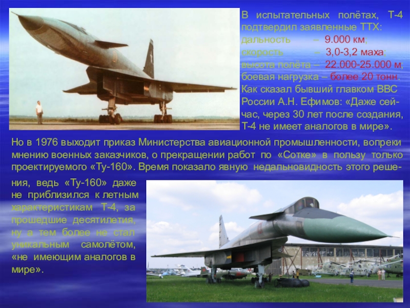 ния, ведь «Ту-160» даже не приблизился к летным характеристикам Т-4, за прошедшие десятилетия, ну а тем более не стал уникальным самолётом, «не имеющим аналогов в мире».