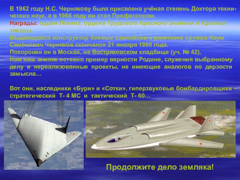 Но в 1976 выходит приказ Министерства авиационной промышленности, вопреки мнению военных заказчиков, о прекращении работ по «Сотке» в пользу только проектируемого «Ту-160». Время показало явную недальновидность этого реше-