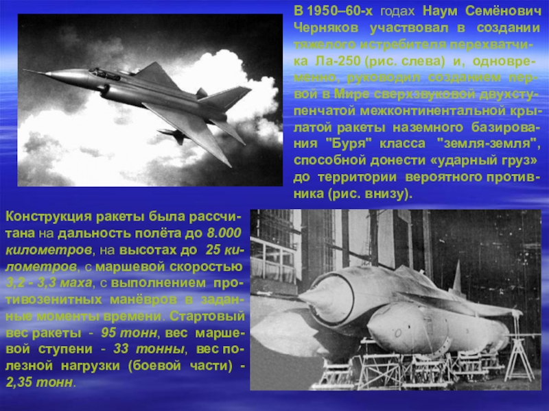 Конструкция ракеты была рассчи-тана на дальность полёта до 8.000 километров, на высотах до 25 ки-лометров, с маршевой скоростью 3,2 - 3,3 маха, с выполнением про-тивозенитных манёвров в задан-ные моменты времени. Стартовый вес ракеты - 95 тонн, вес марше-вой ступени - 33 тонны, вес по-лезной нагрузки (боевой части) - 2,35 тонн.