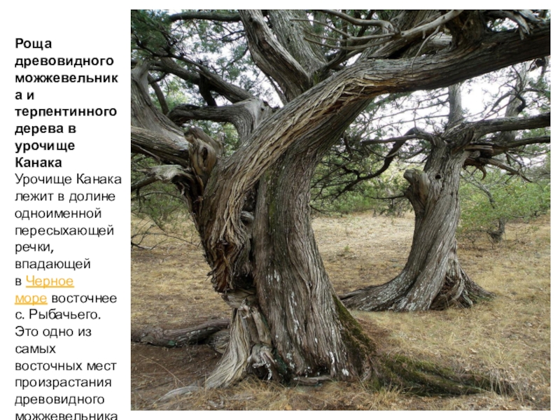Слайд 13Роща древовидного можжевельника и терпентинного дерева в урочище Канака
