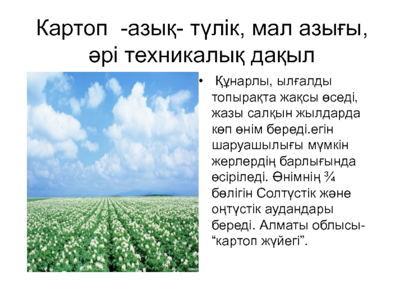 Слайд 24Картоп -азық- түлік, мал азығы, әрі техникалық дақыл