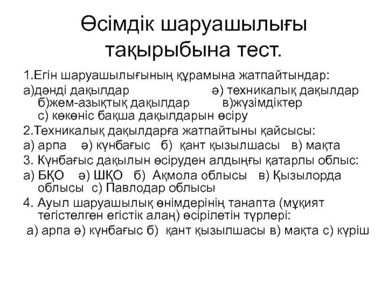 Слайд 28Өсімдік шаруашылығы тақырыбына тест.