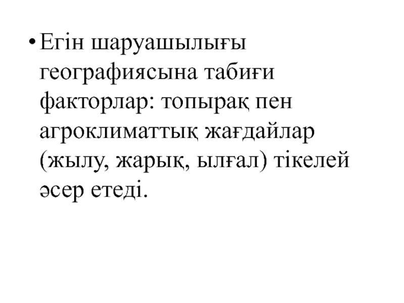 Слайд 8Егін шаруашылығы географиясына табиғи факторлар: топырақ пен агроклиматтық жағдайлар (жылу, жарық,