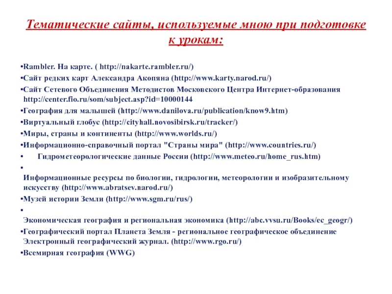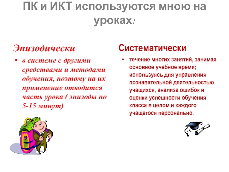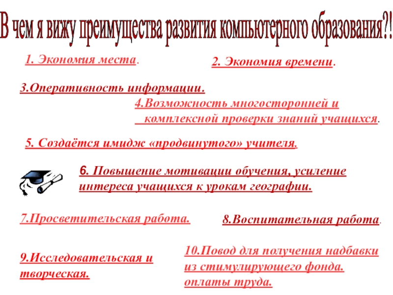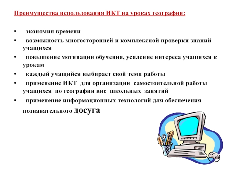 1.Наметить возможные варианты использования ПК и ИКТ на уроках географии в 5-10 классах;