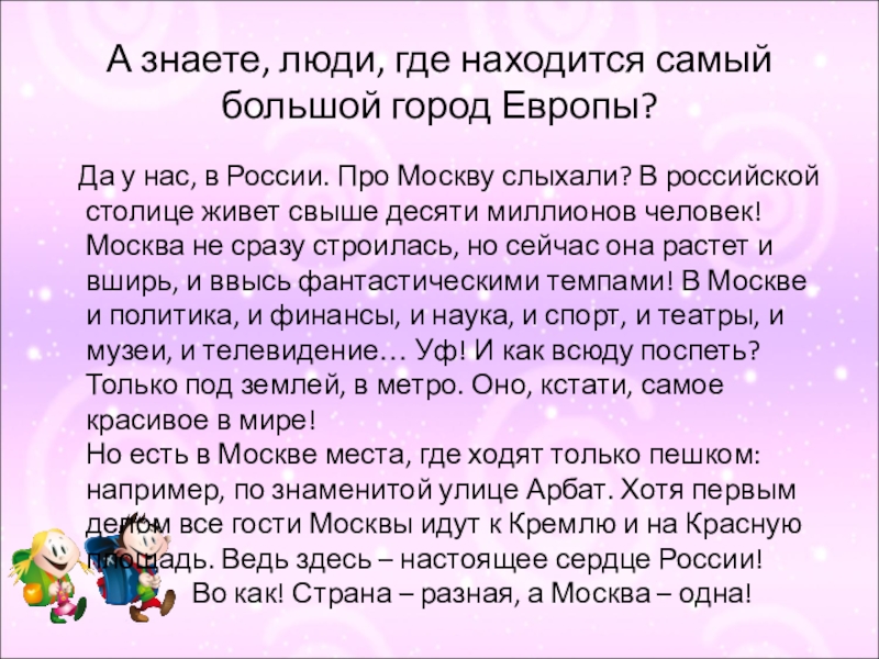 Moscow wasn’t built in a day and right now Moscow’s growing high and wide at a fantastic speed! In Moscow there’s politics, finance, science, sport, theater, museums, television… Whew! How can you get everywhere on time? Only underground, in the metro. By the way, it’s the most beautiful in the world!