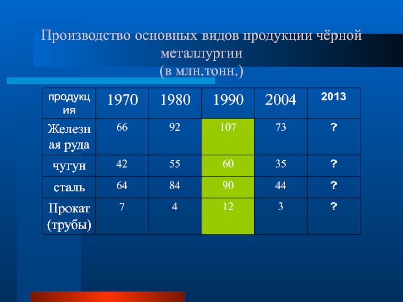 Слайд 5Производство основных видов продукции чёрной металлургии (в млн.тонн.)