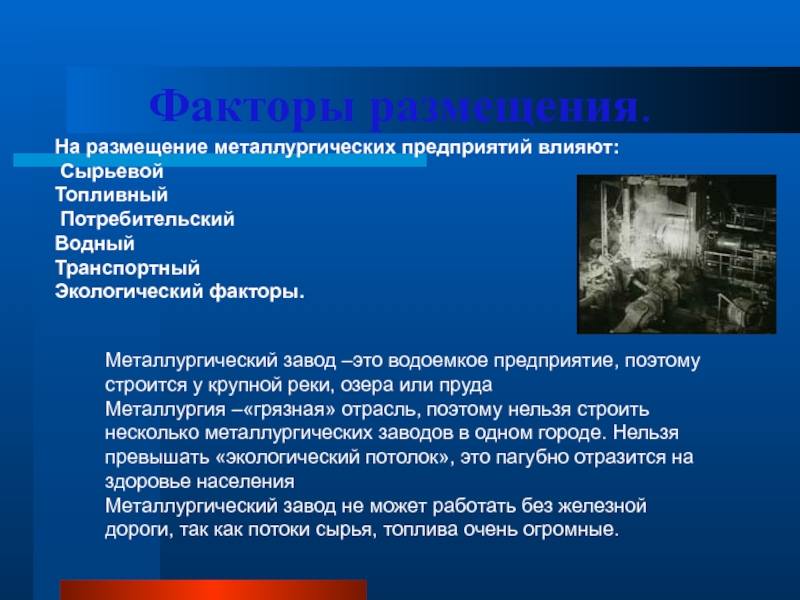 Факторы размещения.На размещение металлургических предприятий влияют: СырьевойТопливный ПотребительскийВодныйТранспортный Экологический факторы.Металлургический завод –это водоемкое предприятие, поэтому строится у