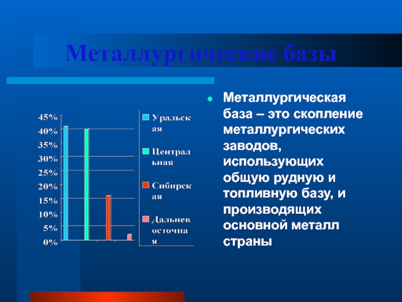 Металлургические базыМеталлургическая база – это скопление металлургических заводов, использующих общую рудную и топливную базу, и производящих основной