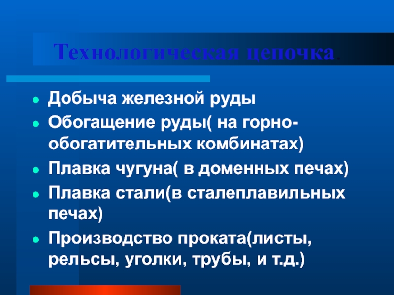 Технологическая цепочка.Добыча железной рудыОбогащение руды( на горно-обогатительных комбинатах)Плавка чугуна( в доменных печах)Плавка стали(в сталеплавильных печах)Производство проката(листы, рельсы,
