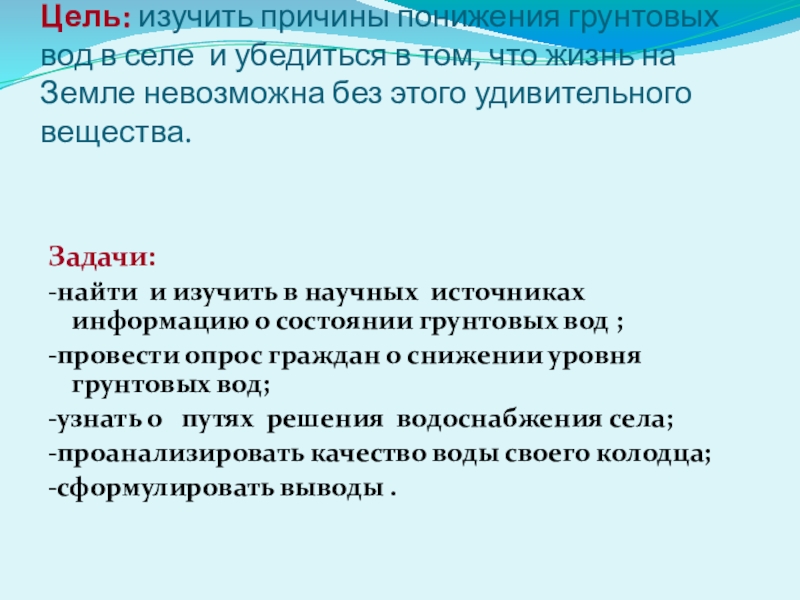 -найти и изучить в научных источниках информацию о состоянии грунтовых вод ;