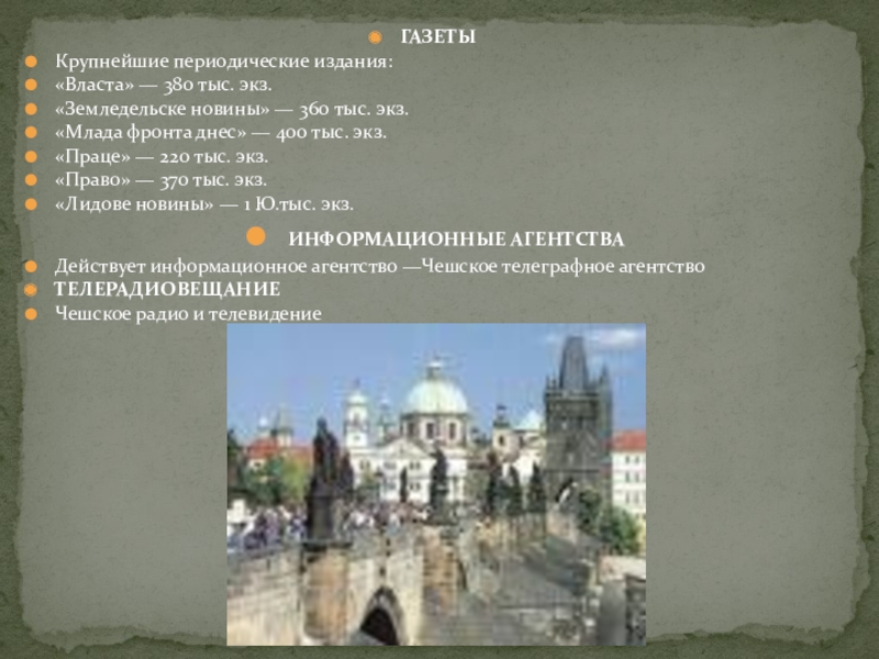 Музеи: Национальный музей (основан в 1900), Этнографический музей им. Напрстака (1862), Национальная художественная галерея. Музей А. Дворжака (1934), Музей Б. Сметаны (1926); планетарий.