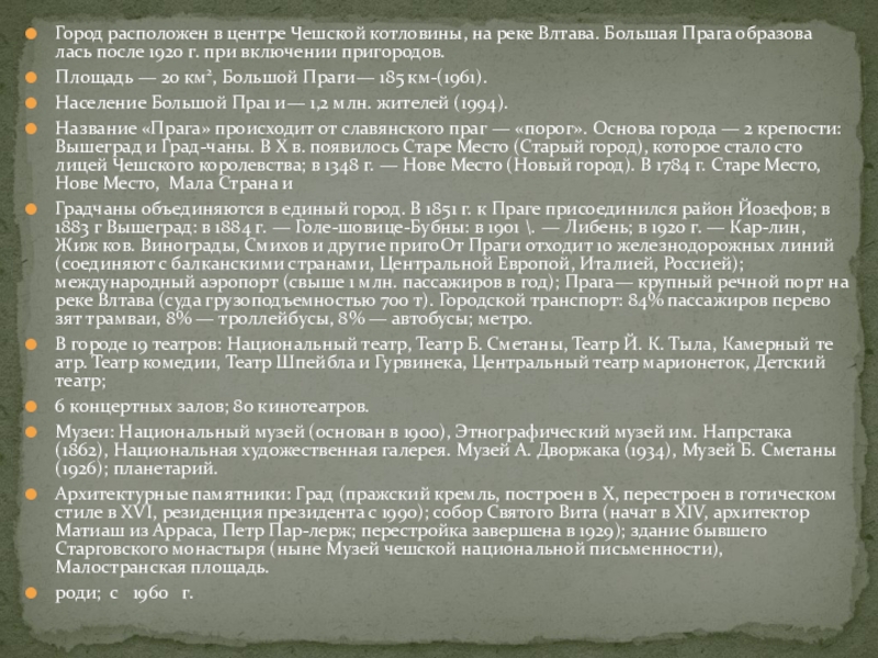 Градчаны объединяются в единый город. В 1851 г. к Праге присоединился район Йозефов; в 1883 г Вышеград: в 1884 г. — Голе-шовице-Бубны: в 1901 \. — Либень; в 1920 г. — Кар-лин, Жиж ков. Винограды, Смихов и другие пригоОт Праги отходит 10 железнодорожных линий (соединяют с балканскими странами, Центральной Европой, Италией, Россией); международный аэропорт (свыше 1 млн. пассажиров в год); Прага— крупный речной порт на реке Влтава (суда грузоподъемностью 700 т). Городской транспорт: 84% пассажиров перевозят трамваи, 8% — троллейбусы, 8% — автобусы; метро.