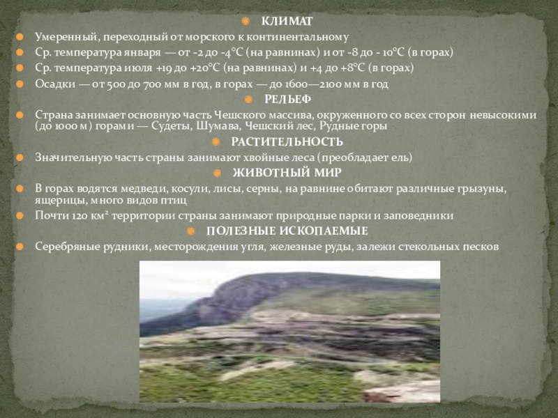 Страна занимает основную часть Чешского массива, окруженного со всех сторон невысокими (до 1000 м) горами — Судеты, Шумава, Чешский лес, Рудные горы