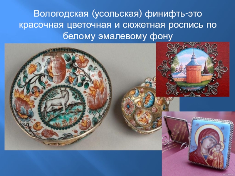 Слайд 8Вологодская (усольская) финифть-это красочная цветочная и сюжетная роспись по белому эмалевому