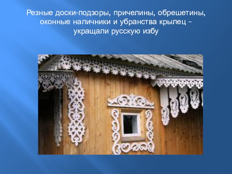 Слайд 4Резные доски-подзоры, причелины, обрешетины, оконные наличники и убранства крылец – укращали
