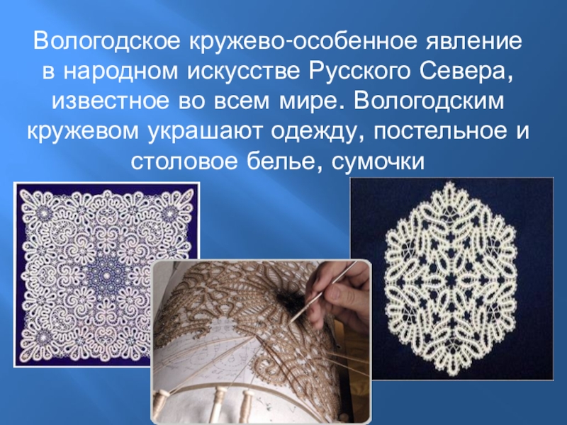 Вологодское кружево-особенное явление в народном искусстве Русского Севера, известное во всем мире. Вологодским кружевом украшают одежду, постельное