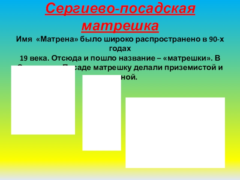 Сергиево-посадская матрешка Имя «Матрена» было широко распространено в 90-х годах 19 века. Отсюда и пошло название –