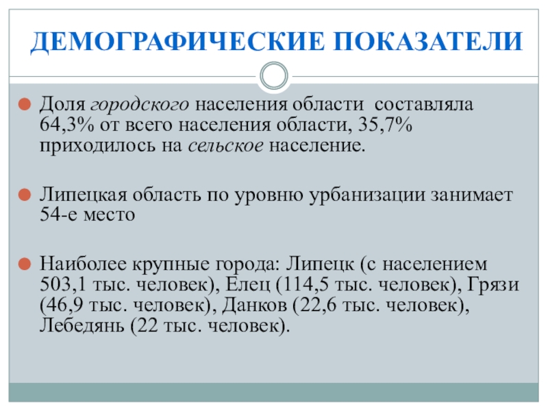 Липецкая область —по уровню урбанизации (уд. вес городского населения — 64 %) — 54-е (без авт. округов).