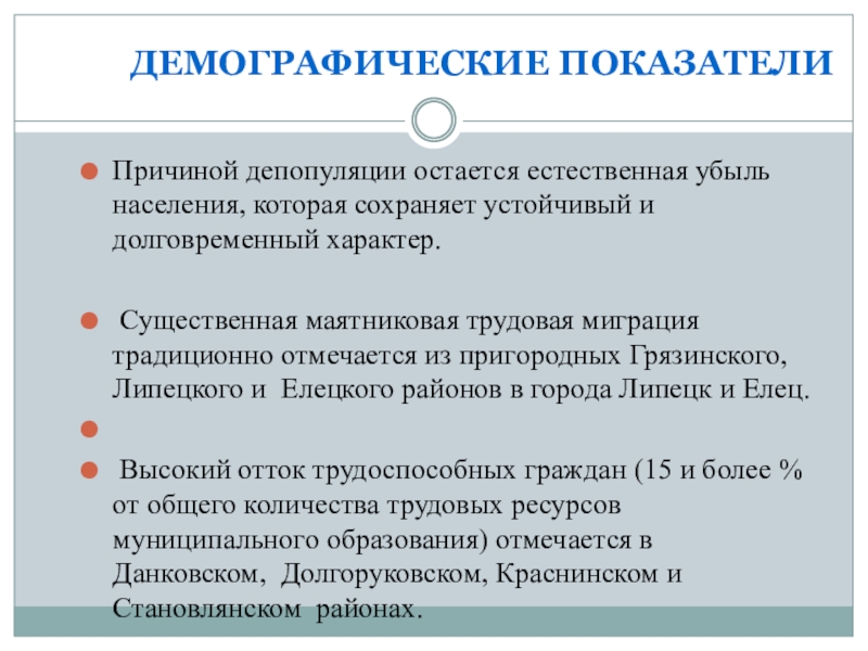 Высокий отток трудоспособных граждан (15 и более % от общего количества трудовых ресурсов муниципального образования) отмечается в Данковском, Долгоруковском, Краснинском и Становлянском районах.