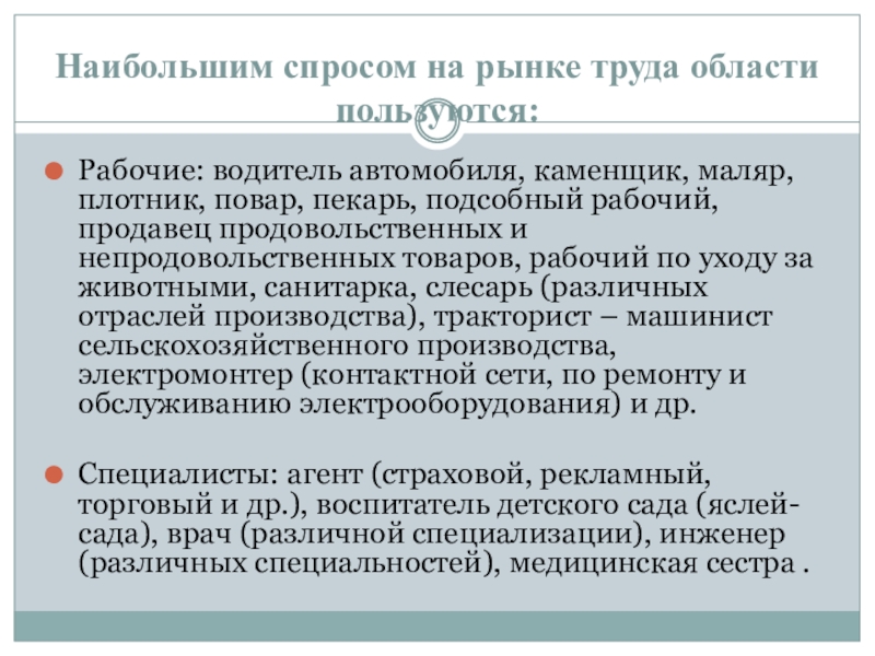 Наибольшим спросом на рынке труда области пользуются: