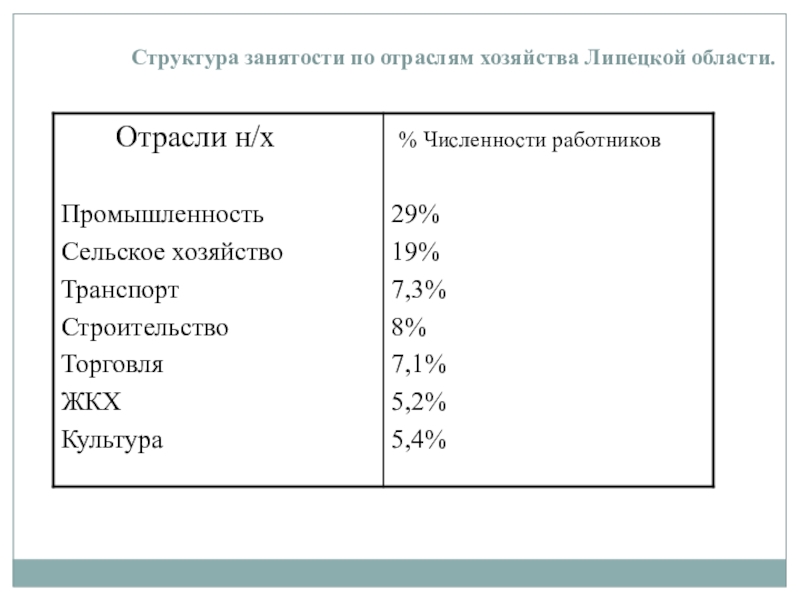 Слайд 27Структура занятости по отраслям хозяйства Липецкой области.