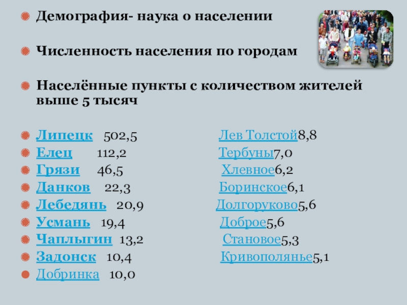 Наиболее крупные города: Липецк (с населением 503,1 тыс. человек), Елец (114,5 тыс. человек), Грязи (46,9 тыс. человек), Данков (22,6 тыс. человек), Лебедянь (22 тыс. человек).