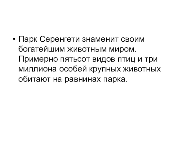 Парк Серенгети знаменит своим богатейшим животным миром. Примерно пятьсот видов птиц и три миллиона особей крупных животных