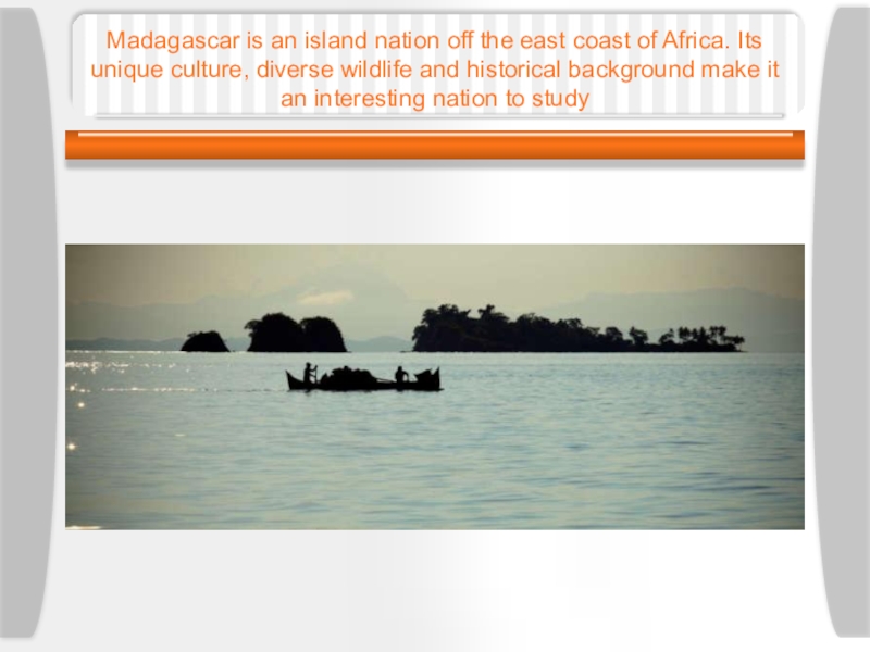 Слайд 12Madagascar is an island nation off the east coast of Africa.