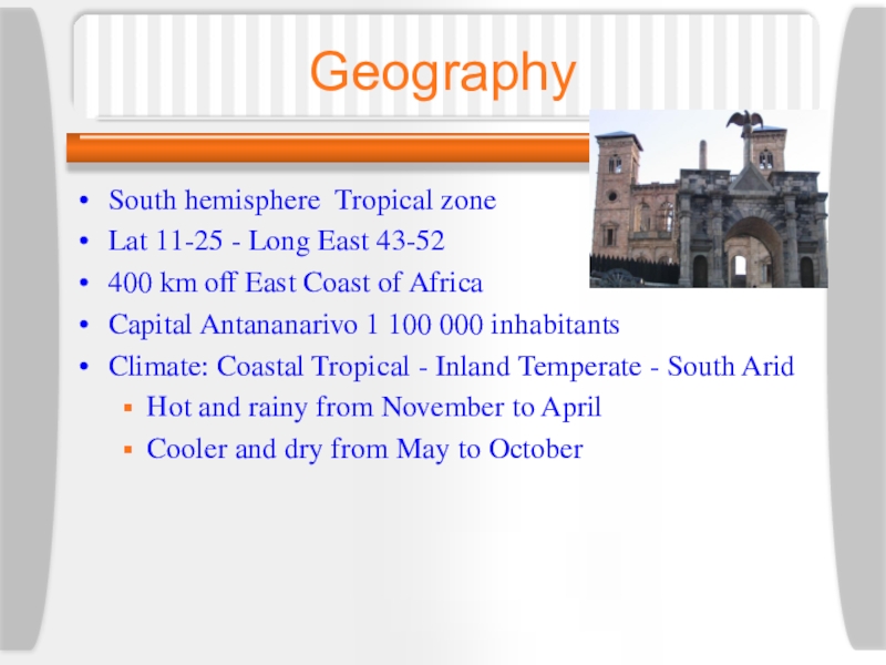 GeographySouth hemisphere Tropical zone Lat 11-25 - Long East 43-52400 km off East Coast of AfricaCapital Antananarivo
