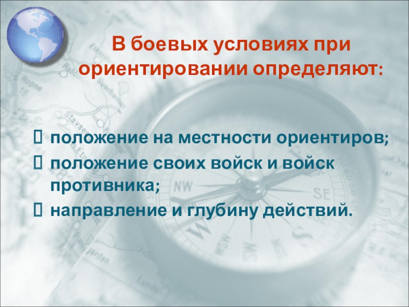 В боевых условиях при ориентировании определяют:положение на местности ориентиров;положение своих войск и войск противника;направление и глубину действий.