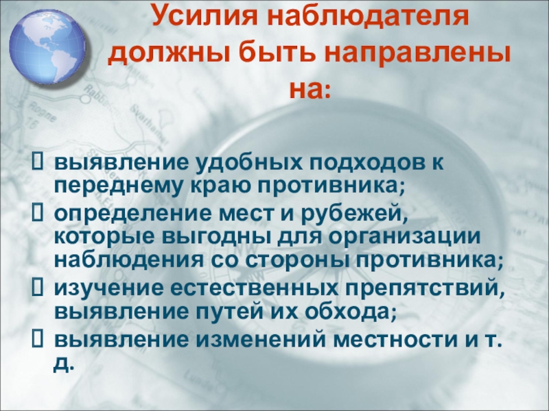 Усилия наблюдателя должны быть направлены на:выявление удобных подходов к переднему краю противника;определение мест и рубежей, которые выгодны