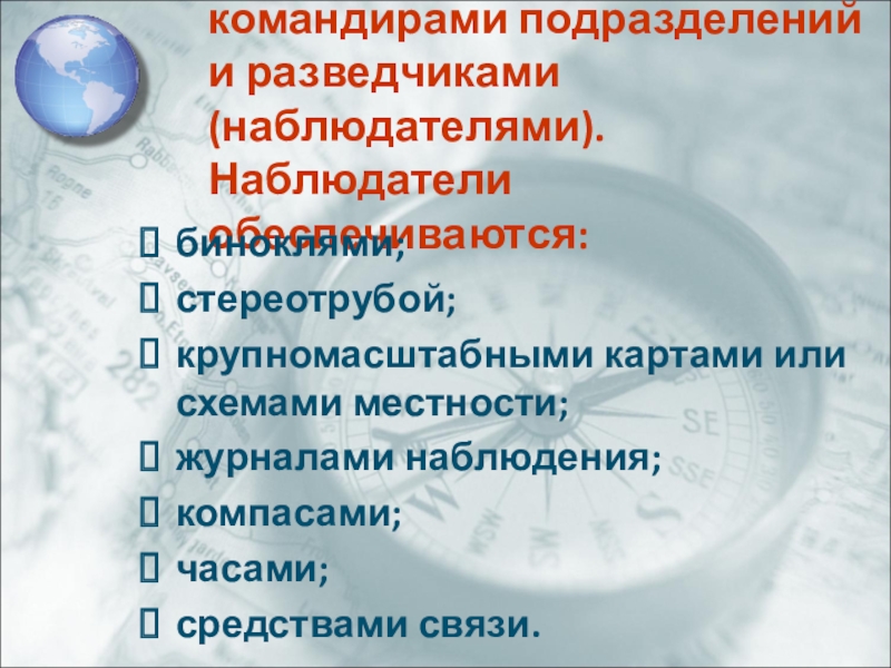 Слайд 12Наблюдение ведётся лично командирами подразделений и разведчиками (наблюдателями). Наблюдатели обеспечиваются: