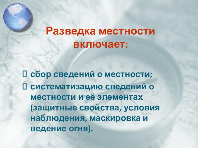 Разведка местности включает: сбор сведений о местности;систематизацию сведений о местности и её элементах (защитные свойства, условия наблюдения,