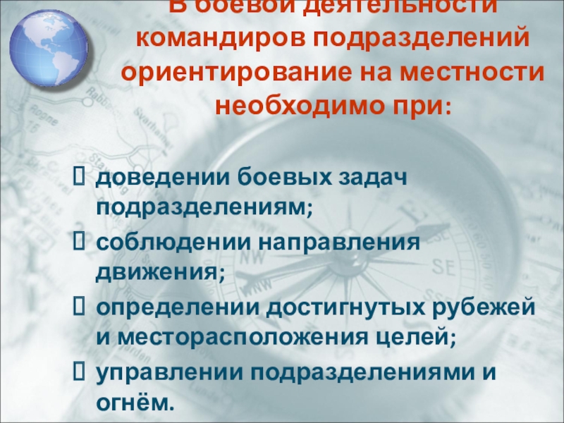 Слайд 3В боевой деятельности командиров подразделений ориентирование на местности необходимо при: