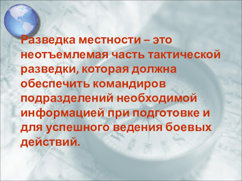 Слайд 8Разведка местности – это неотъемлемая часть тактической разведки, которая должна обеспечить