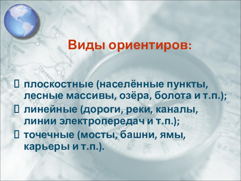 Виды ориентиров: плоскостные (населённые пункты, лесные массивы, озёра, болота и т.п.);линейные (дороги, реки, каналы, линии электропередач