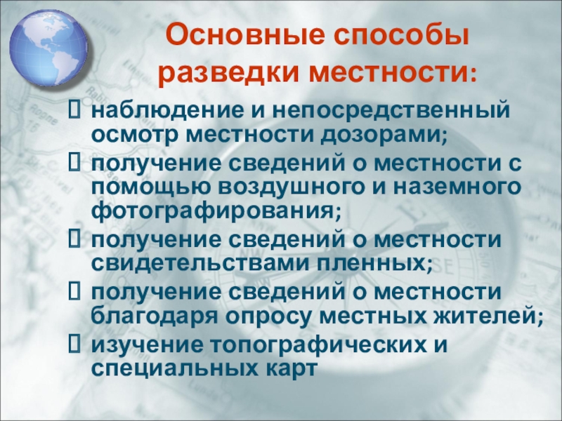 Основные способы разведки местности:наблюдение и непосредственный осмотр местности дозорами;получение сведений о местности с помощью воздушного и наземного