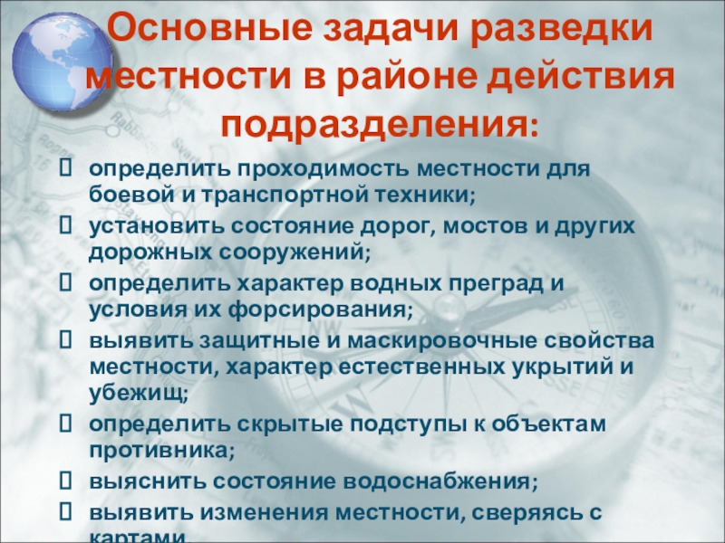 Основные задачи разведки местности в районе действия подразделения: определить проходимость местности для боевой и транспортной техники;установить состояние