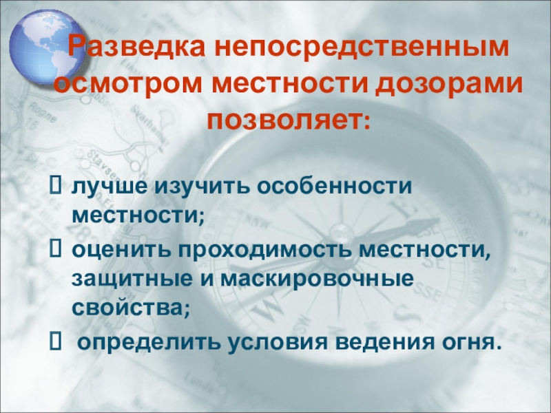 Разведка непосредственным осмотром местности дозорами позволяет: лучше изучить особенности местности;оценить проходимость местности, защитные и маскировочные свойства; определить